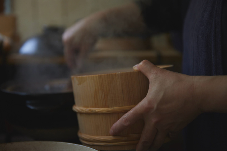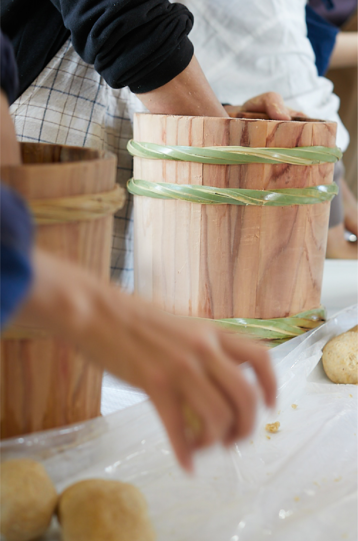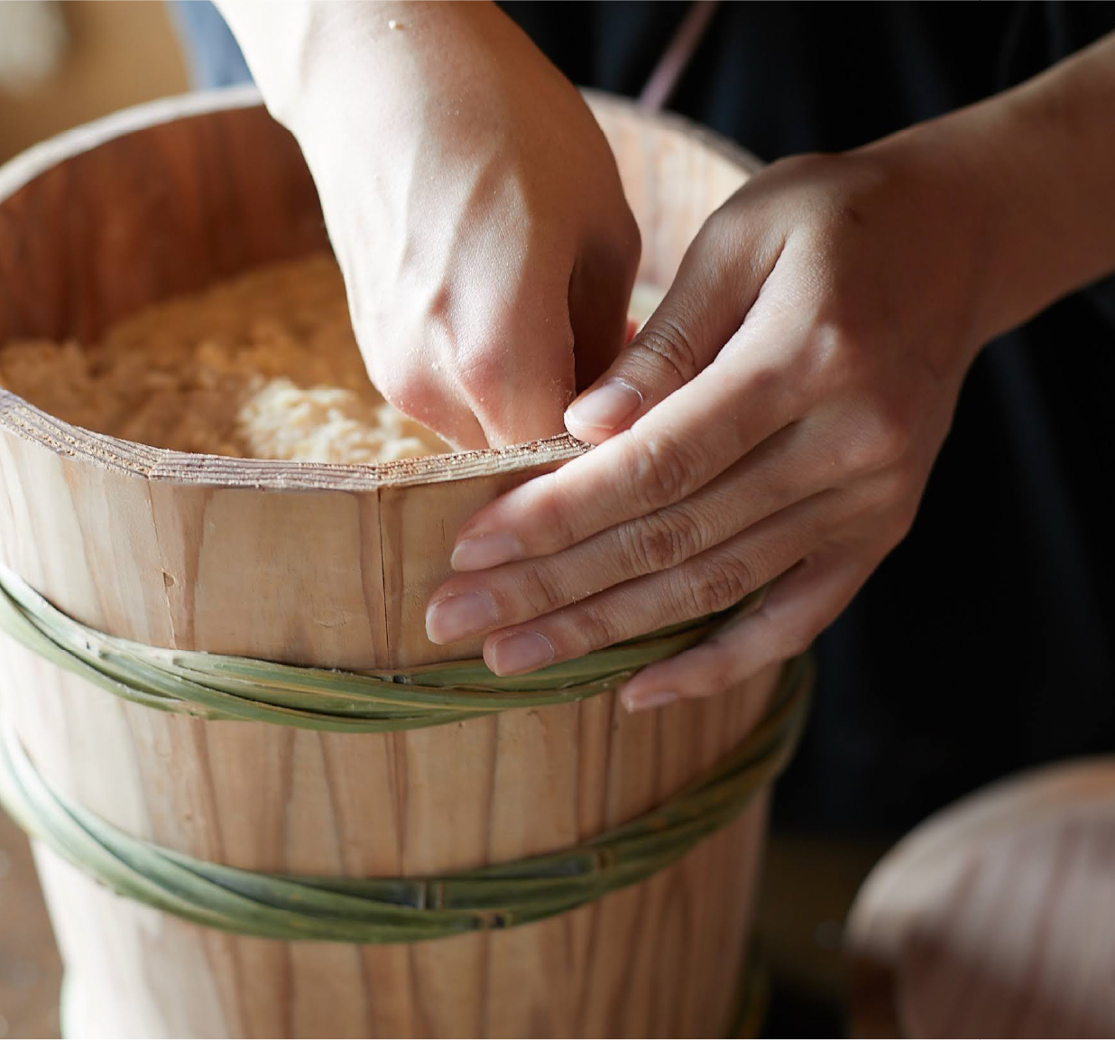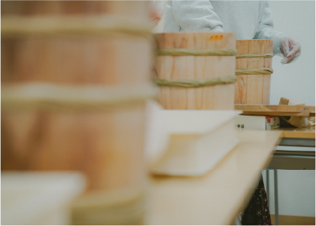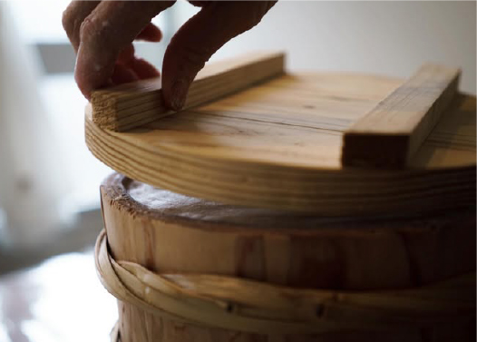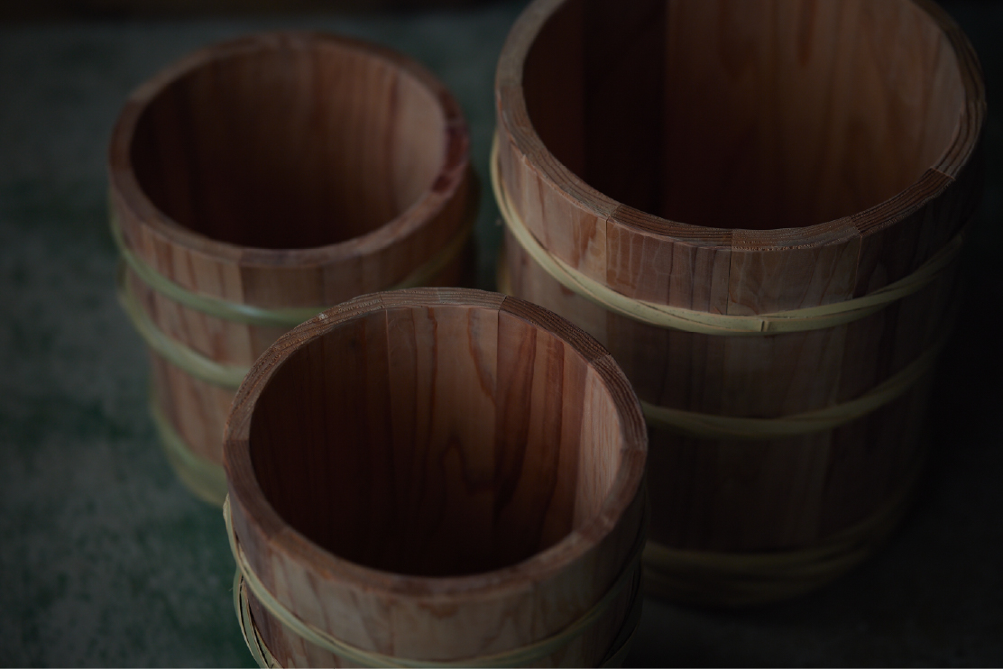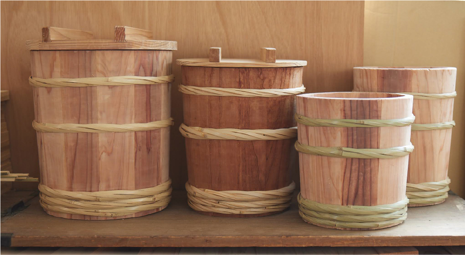ぬんが得意とする、味噌仕込み用の木桶。福島県産の木材と竹を使い、ひとつずつ昔ながらの技術でつくり上げていきます。使えば使うほどに味が出る、一緒に成長していく木桶です。